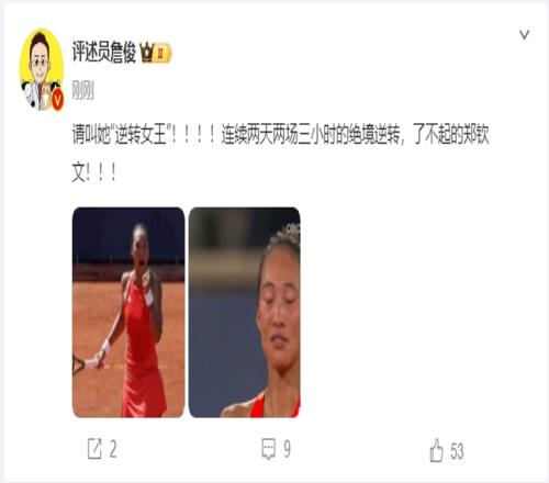 詹俊:请叫她“逆转女王”!!!!连续两天两场三小时的绝境逆转,了不起的郑钦文!!!