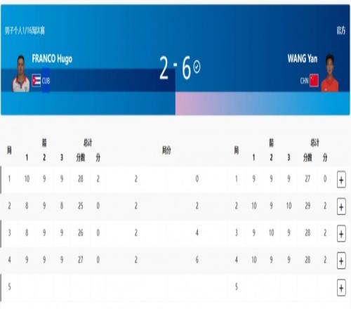 经过激烈角逐,王岩除第一局27-28惜败古巴选手外,后3局都以绝对优势赢下比赛,总比分6-2击败对手,晋级16强!