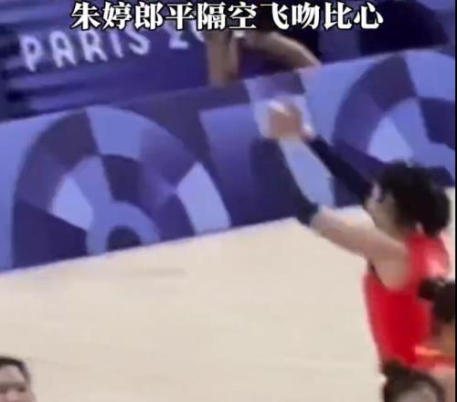赛后,朱婷在和队友庆祝完毕后,朝观众席连续比心。