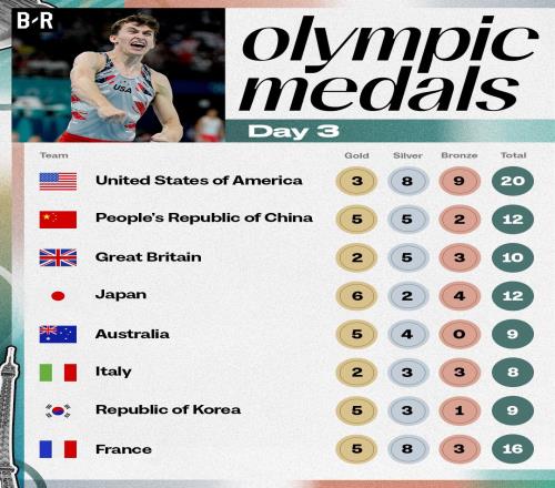 著名美媒BR晒奖牌榜:巴黎奥运第3日美国领衔奖牌榜!