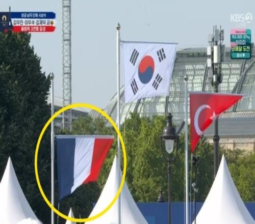 在7月29日射箭男子团体的比赛中,韩国夺得冠军,法国获得亚军,而土耳其是季军。但在颁奖仪式上,获得银牌的法国的国旗升起的高度却低于获得铜牌的土耳其国旗。按照常规,亚军法国国旗的位置应高于季军土耳其的国旗。