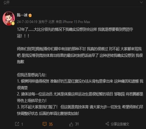 陈一冰:12年了……大比分领先的情况下我确实没想到会这样 我就是想要看到男团夺冠!!!