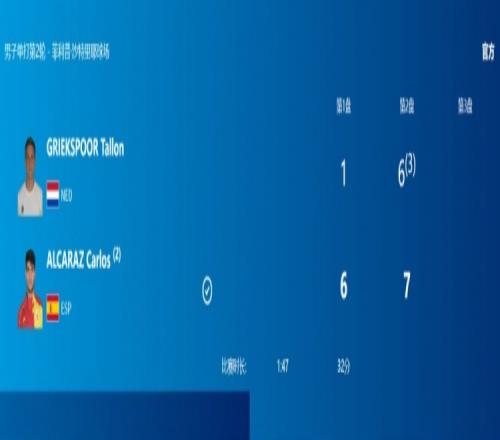 网球男单次轮:阿尔卡拉斯历经1小时47分钟20战胜荷兰选手