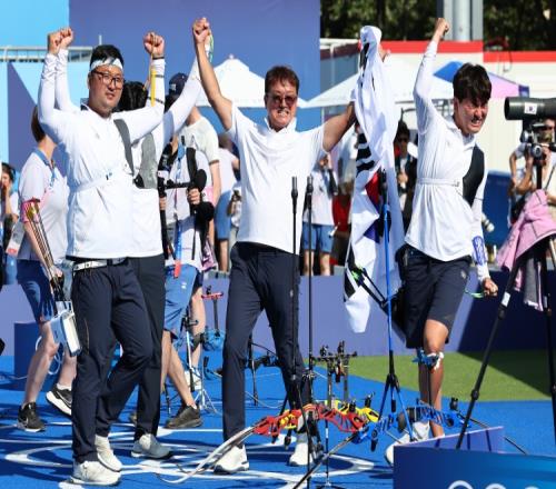 随着韩国男队的夺冠,韩国队包揽了射箭项目团体赛的冠军。