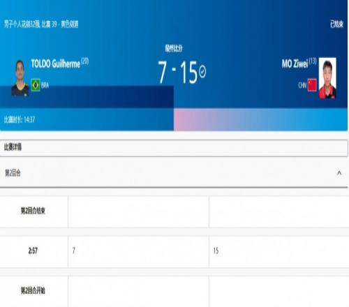 男子花剑116决赛:莫梓维15比7巴西选手,晋级男子花剑16强