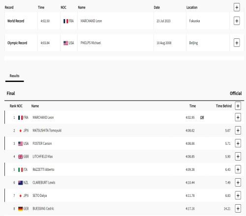 马尔尚游出4分02秒95的成绩,打破了美国名将菲尔普斯在2008年创造的奥运纪录。马尔尚还手握这个项目的世界纪录(4分02秒50)。