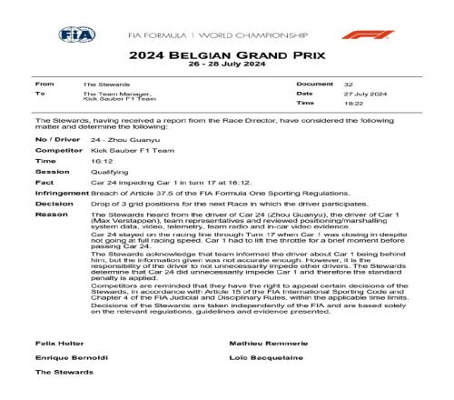 在F1比利时站排位赛Q1的最后阶段中,周冠宇涉嫌阻挡维斯塔潘,而维斯塔潘也在Team Radio中对周冠宇表达了不满。最终周冠宇被罚正赛退后3位发车。