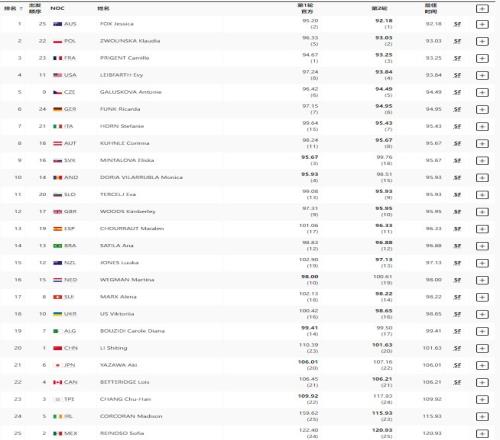 最终,依靠第2轮的不错发挥,李诗婷最终总成绩排在第20位,晋级北京时间7月28日21:30的半决赛!