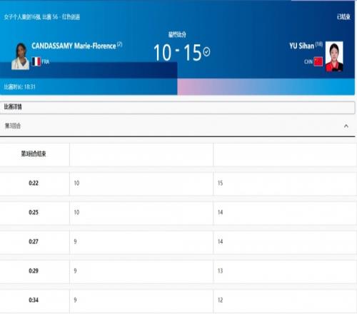 第三回合,双方都比较谨慎,余思涵吃到黄牌后双方又各自吃到黄牌,裁判鼓励主动进攻;余思涵关键时刻敢拼,连续反击得分领先到4分,最终余思涵15-10击败劲敌坎达赛米,晋级8强!