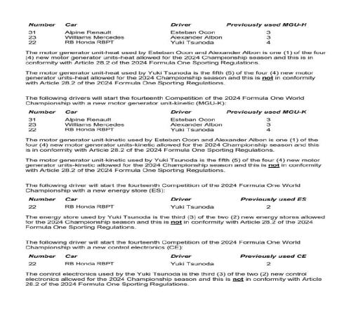 此外,角田裕毅则更换了全套动力单元部件,周日正赛确定将在队尾发车。