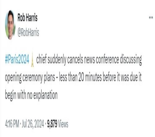 体育资讯7月26日报道宣称 今日,据知名记者Rob Harris报道,在巴黎奥运会开幕式新闻发布会召开前不到20分钟,官方突然宣布本场发布会取消,而且没有给出原因。