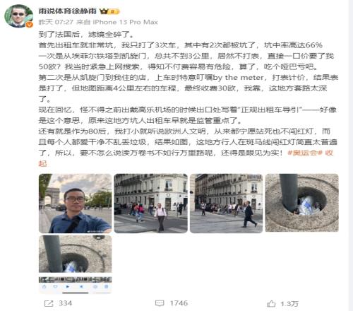 体育资讯7月26日报道宣称 名嘴徐静雨今天更新微博,吐槽了2024年奥运主办方法国,全文如下: