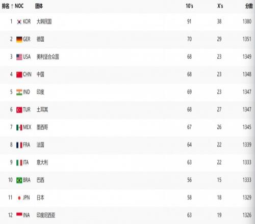 在射箭混团排位赛中,中国混团以1348分暂列第四,前三分别是韩国、德国和美国。