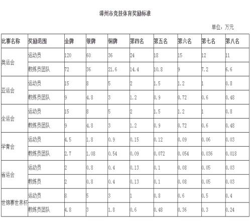2.奖励涉及赛会:奥运会、亚运会、全运会、青运会、省运会、世锦赛、世界杯赛,以及各级残疾人运动会、特殊奥林匹克运动会。