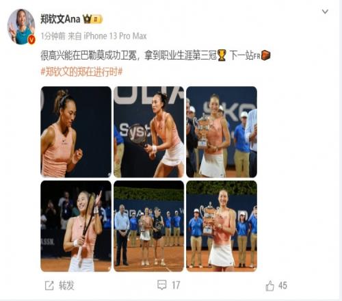 赛后,郑钦文更新了社媒,庆祝了这个来之不易的冠军。郑钦文写道:很高兴能在巴勒莫成功卫冕,拿到职业生涯第三冠