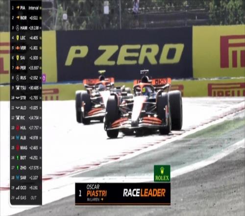 体育资讯7月21日报道宣称 F1匈牙利大奖赛,第68圈,诺里斯按照车队的要求将头名让给了队友皮亚斯特里。