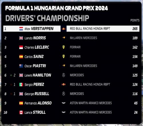 截至目前,车手积分榜上维斯塔潘仍居第一,诺里斯第二,汉密尔顿此役过后连升2位来到第六。