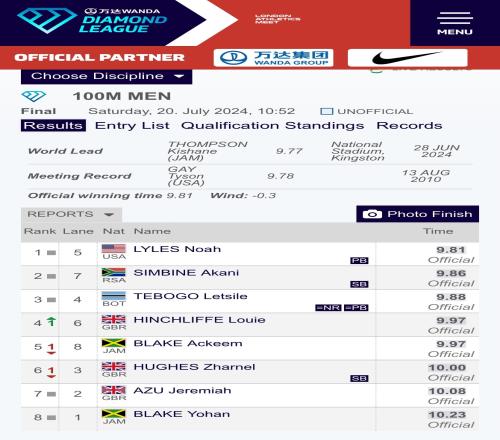 体育资讯07月20日报道宣称 在刚刚结束的钻石联赛伦敦站男子百米中,每秒0.3米的微弱逆风下,美国选手莱尔斯跑出9秒81,刷新个人最好成绩(PB)。