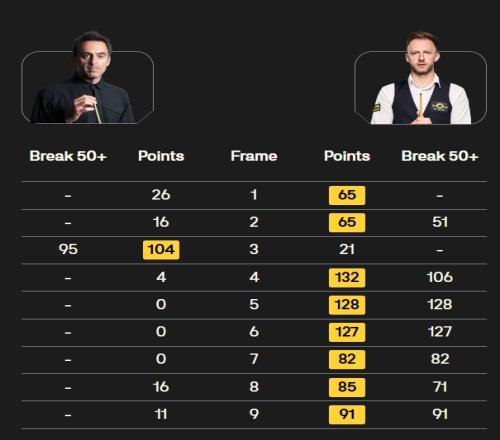第五局和第六局,特鲁姆普打出单杆128分和127分,连续三杆破百,比分来到5-1。此后特鲁姆普又连续赢下3局,最终以8-1结束首阶段比赛。