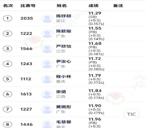 北京时间8月11日,第一届全国青少年田径运动会女子100米决赛,浙江选手陈妤颉以11秒29获得冠军,比赛时顺风每秒0.5米。