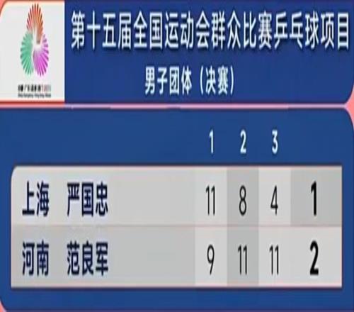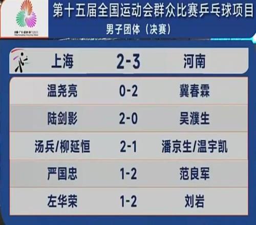 第十五届全运会群众比赛乒乓球项目的男子团体决赛今晚打响,上海队对阵河南队,在经过五场鏖战后,上海队以2-3不敌河南队,遗憾摘得银牌!但不可否认的是,能够站在赛场上的运动员都是好样的!他们都战胜了自己!