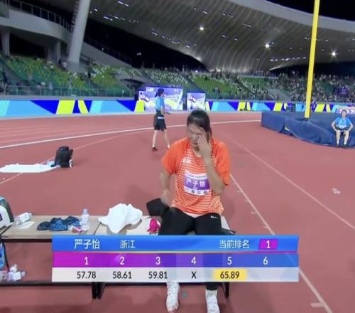 严子怡的坚持得到了回报,她在第五枪投出了65米89的成绩,一举刷新了女子标枪的青年世界纪录。在完成这一投后,严子怡哭了,泪水夺眶而出,她拽起衣角试图擦掉眼泪,但泪水还是不停地流下来。