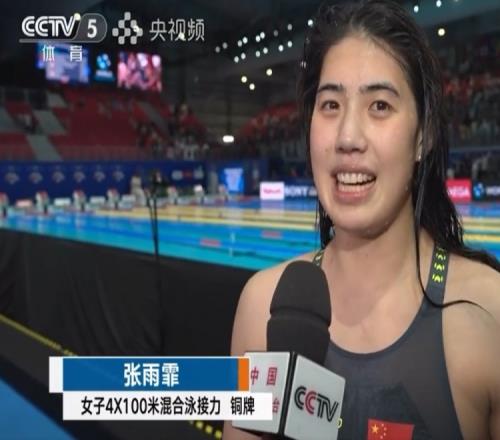 体育资讯8月3日报道宣称 世锦赛女子4x100米混合泳接力,由彭旭玮、程玉洁、唐钱婷、张雨霏组成的中国队游出3:54.77收获铜牌。赛后,张雨霏、唐钱婷接受了记者采访。