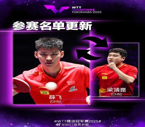 WTT官方表示,横滨冠军赛参赛球员更新,梁靖崑退赛,薛飞递补参赛。帕特里克-弗朗西斯卡退赛,西蒙-高茨递补参赛。2025年横滨冠军赛将于8月7日-11日在横滨文化体育馆进行。