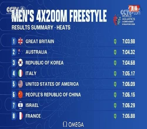 世锦赛男子4x200米自由泳接力预赛:中国队第六晋级决赛