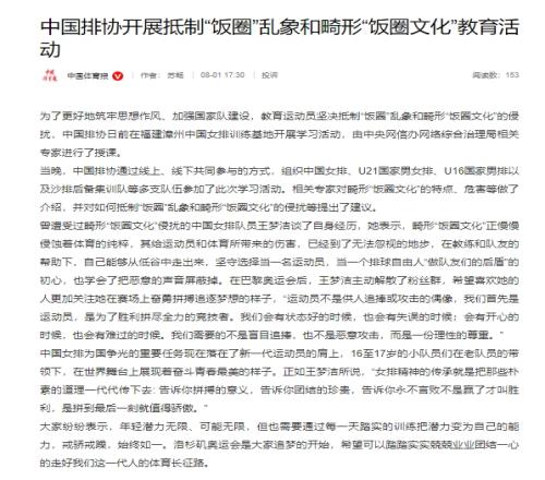 体育资讯08月01日报道宣称 据中国体育报报道,中国排协开展了抵制“饭圈”乱象和畸形“饭圈文化”教育活动。