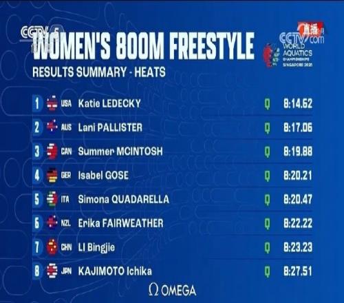 李冰洁预赛游出了8分23秒23,排名第七晋级决赛。