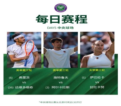 男单二号种子阿尔卡拉斯将亮相中央球场,冲击温网男单16强,他的对手是施特鲁夫。女单头号种子萨巴伦卡将在中央球场第三场亮相,她的对手是本土选手拉杜卡努。