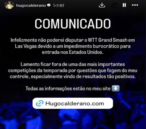 体育资讯07月04日报道宣称 世界排名第三的巴西乒乓球选手雨果-卡尔德拉诺发文,确认因签证问题无法前往美国参加WTT美国大满贯比赛。