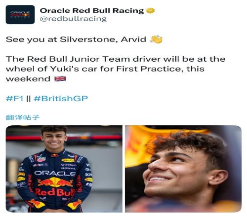 官方:红牛17岁车手林德布拉德替代角田裕毅,参加英国大奖赛一练