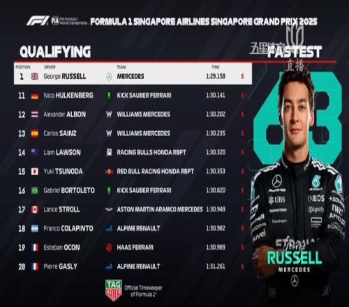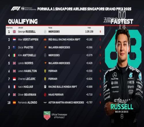 2025赛季F1新加坡大奖赛战火再燃,在北京时间今天晚间举行的排位赛中,梅奔车队的拉塞尔在维斯塔潘与麦克拉伦双雄的竞争中杀出重围,以1:29.158的超强成绩,夺得新加坡站杆位!夺得了个人赛季第二杆!
