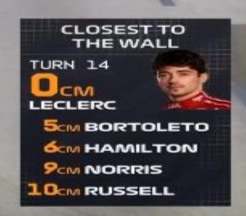 值得一提的是,在这条赛道上,大家都跑得十分极限,勒克莱尔在14号弯跑出了贴墙0cm的极限走位......