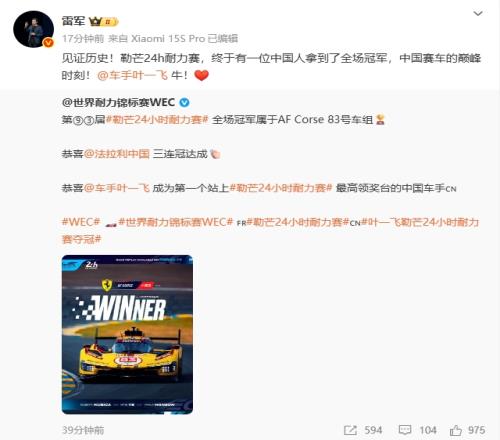 对此小米集团董事长雷军送来祝贺:见证历史!勒芒24h耐力赛,终于有一位中国人拿到了全场冠军,中国赛车的巅峰时刻!叶一飞牛!