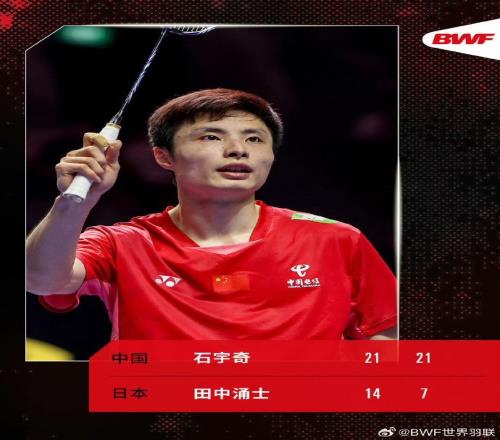 石宇奇以21-14 21-7轻松击败田中涌士,晋级印尼羽毛球公开赛八强。