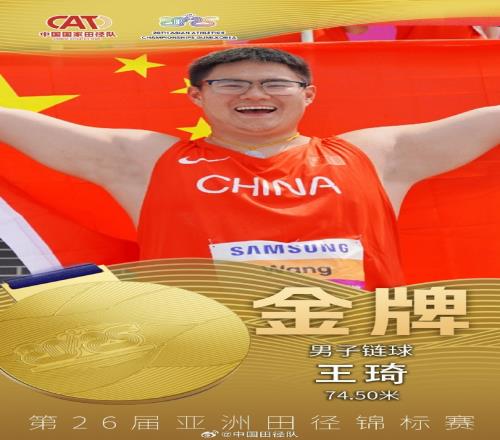 体育资讯5月28日报道宣称 第26届亚洲田径锦标赛,中国选手王琦蝉联男子链球项目冠军。他掷出74.50米刷新该项目当前赛季亚洲最佳成绩,再度登上亚锦赛冠军领奖台。