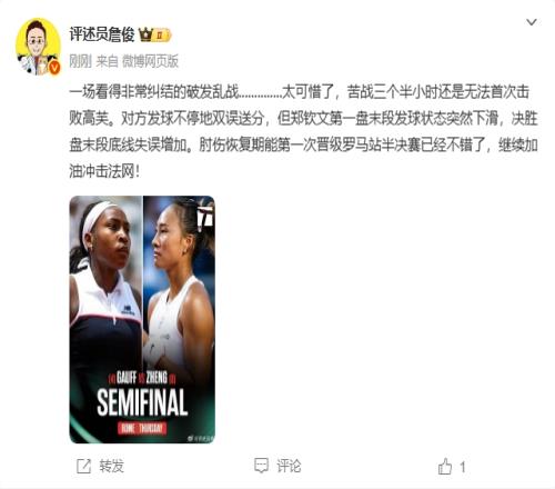 体育资讯05月16日报道宣称 WTA1000罗马站,郑钦文不敌高芙,高芙晋级决赛将战保利尼。赛后詹俊发文。