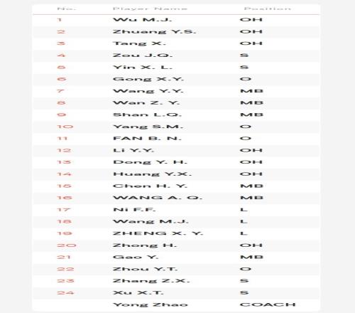 主攻:李盈莹、吴梦洁、庄宇珊、唐欣、董禹晗、黄悦鑫、仲慧