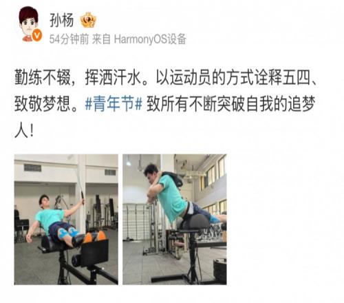 孙杨为照片配文写道:“勤练不辍,挥洒汗水。以运动员的方式诠释五四、致敬梦想。青年节致所有不断突破自我的追梦人!”