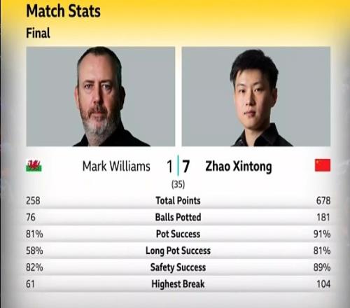 单杆最高得分 赵心童104-61马克-威廉姆斯