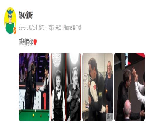 赵心童更新个人微博,晒出与奥沙利文数张图并写道:感谢有你❤️