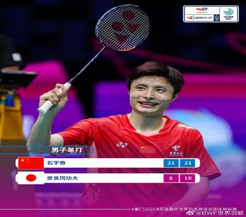 体育资讯5月3日报道宣称 在刚刚结束的苏迪曼杯羽毛球团体赛半决赛中,中国选手石宇奇2比0击败日本选手奈良冈功大,帮助中国队取得2比0的领先。
