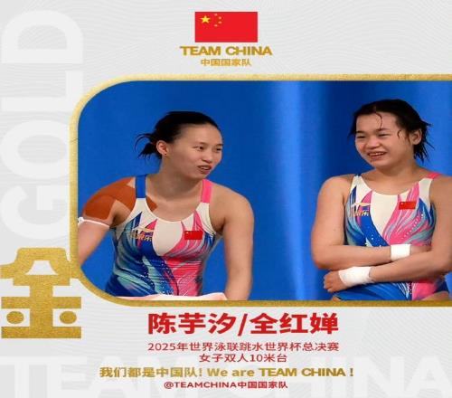 这是全红婵和陈芋汐自巴黎奥运会后首次合作,她们从第一跳开始保持领先,最终五跳350.88分无悬念夺冠,成功卫冕。