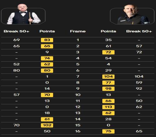 第二阶段希金斯打出两杆50+(57、70),威廉姆斯打出五杆50+(92、50、51、62、65),上半场结束威廉姆斯追平总比分至6-6。