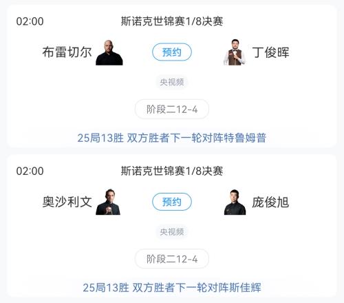 在1/8决赛中,赵心童在内战中淘汰了雷佩凡,肖国栋12-13惜败希金斯,斯佳辉淘汰沃拉斯顿晋级,目前丁俊晖和庞俊旭命悬一线,分别以4-12落后于布雷切尔和奥沙利文。