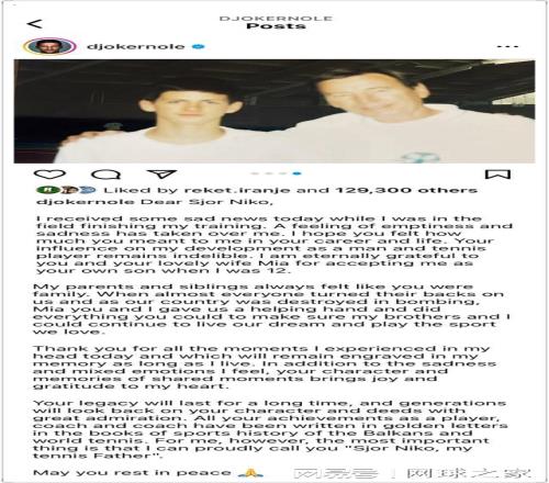 德约科维奇在悼文的结尾写道:“安息吧”无声地诉说着失去至亲般的痛楚。