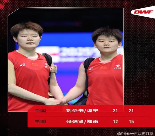 本场比赛中,刘圣书/谭宁2-0张殊贤/郑雨,两局比分为:21-12、21-15。